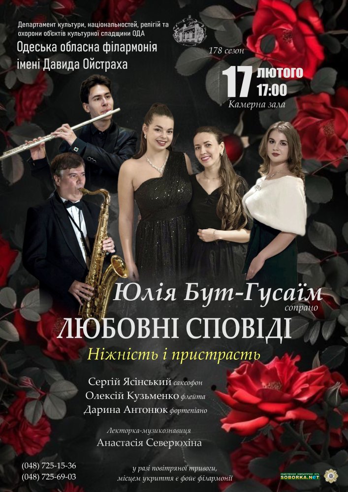 Програма представлена у форматі сольного концерту солістки Одеської філармонії Юлії Бут-Гусаїм, чий голос проведе слухачів крізь світ емоцій, сповнених щирості, глибини та чуттєвості. У концерті прозвучать вокальні твори, наповнені інтимною лірикою, а також яскраві й пристрасні композиції, сповнені енергії та емоційної напруги. Кожен номер — це окрема любовна сповідь, сказана мовою музики.
